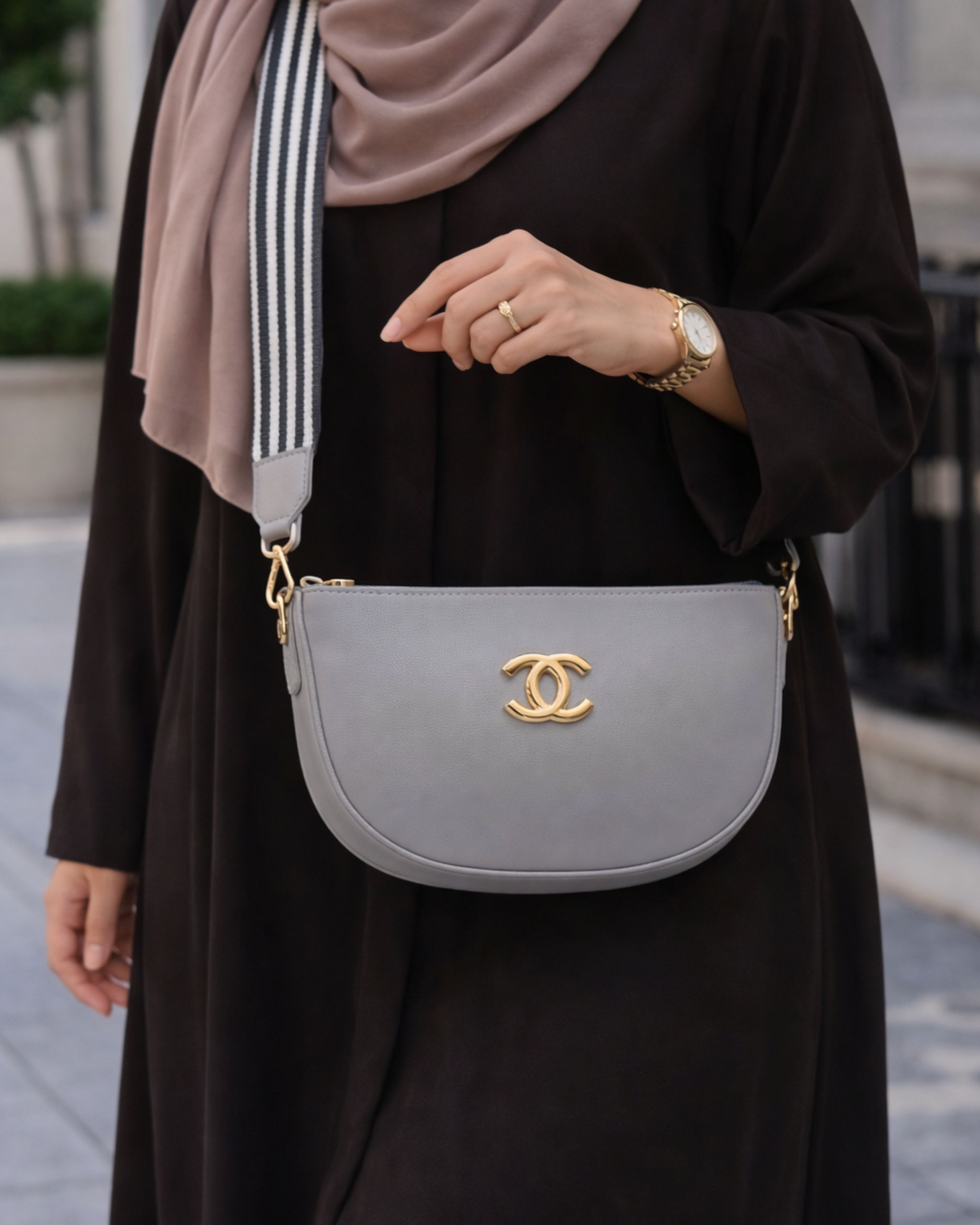 Modern, minimal, and effortlessly chic, the ALEAN URBAN MIST is designed for women who love sleek sophistication. The soft grey tone paired with elegant gold detailing creates a refined everyday essential, while the bold striped strap adds a contemporary edge.