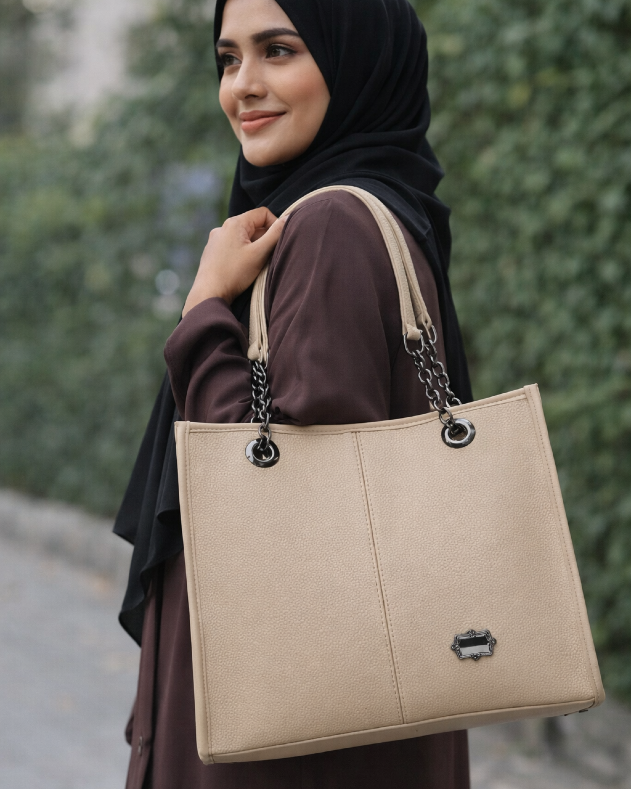 • Premium textured finish • Spacious interior for daily essentials • Stylish chain-detail handles • Structured shape for a polished look • Perfect for office, university & outings