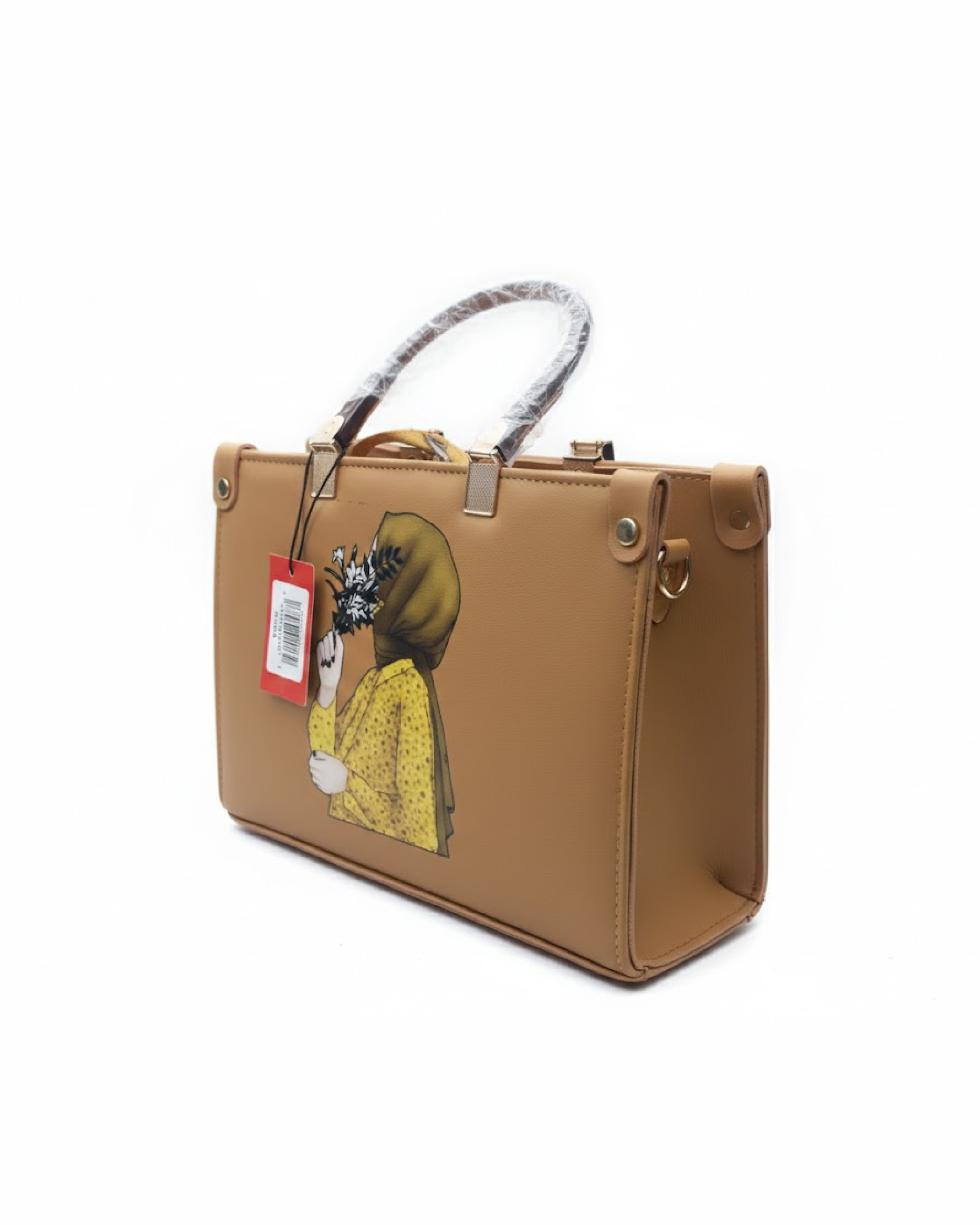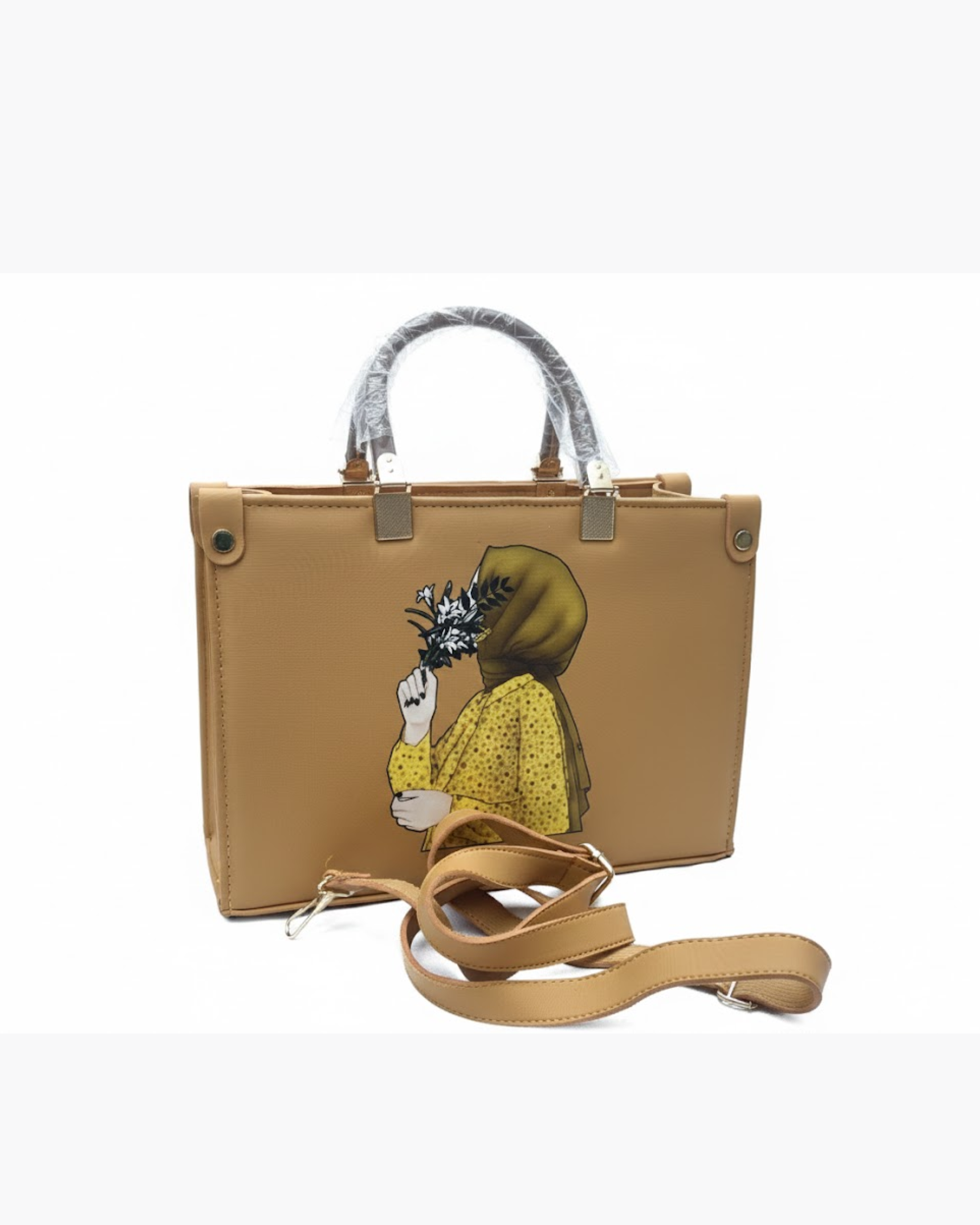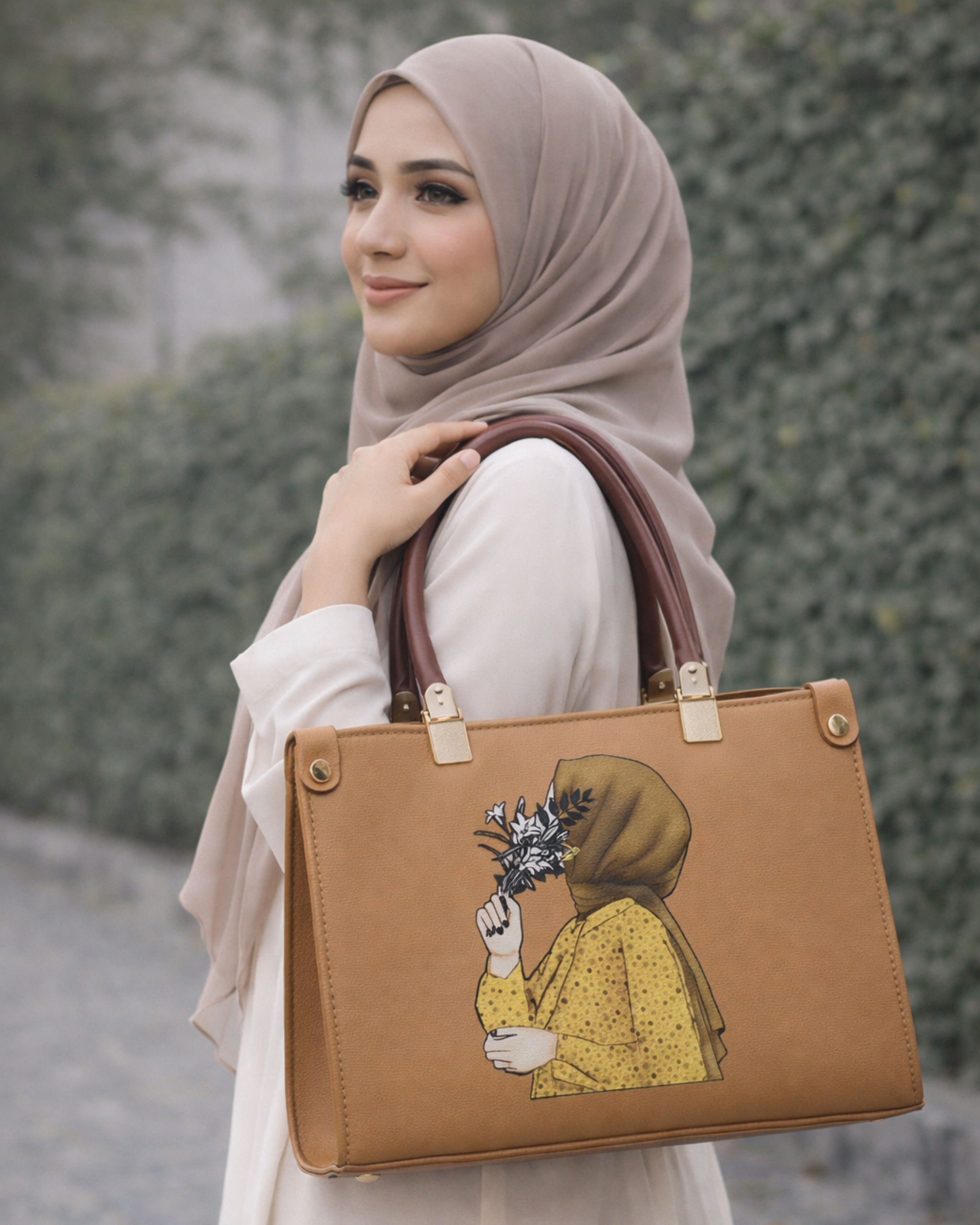 A beautiful blend of art and elegance, Aleen Floral Muse is designed for women who carry grace with confidence. The soft tan finish paired with the delicate illustrated hijabi artwork makes this bag truly unique.