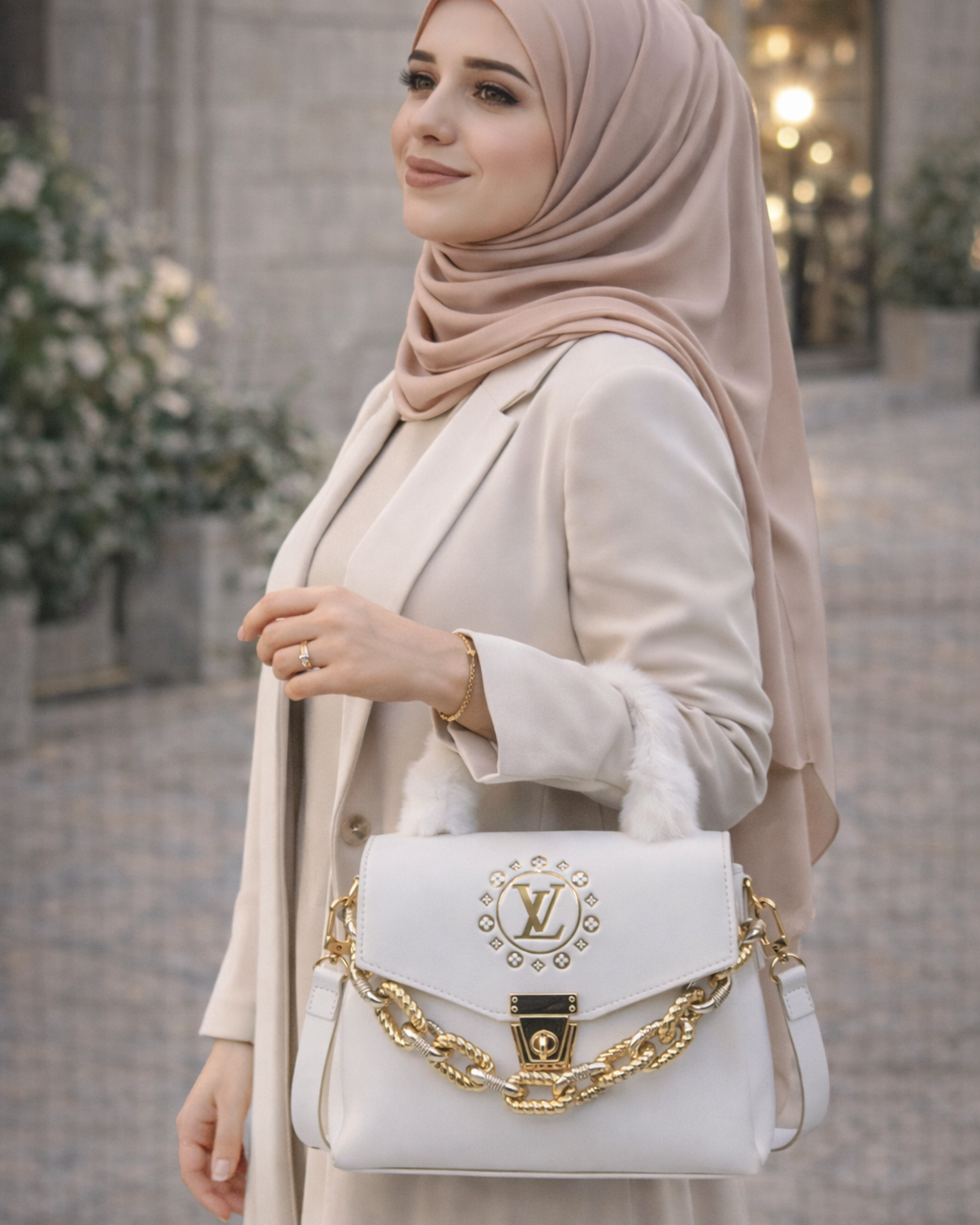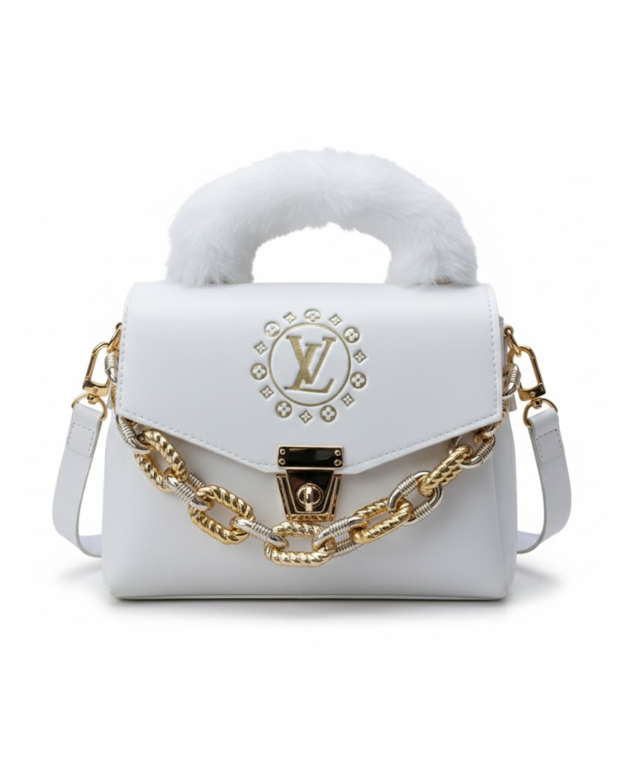Chic, radiant, and undeniably bold, Aleen Ivory Luxe is designed for women who embrace elegance with a statement twist. The crisp white body paired with plush fur detailing and striking gold chain hardware creates a powerful blend of softness and luxury.