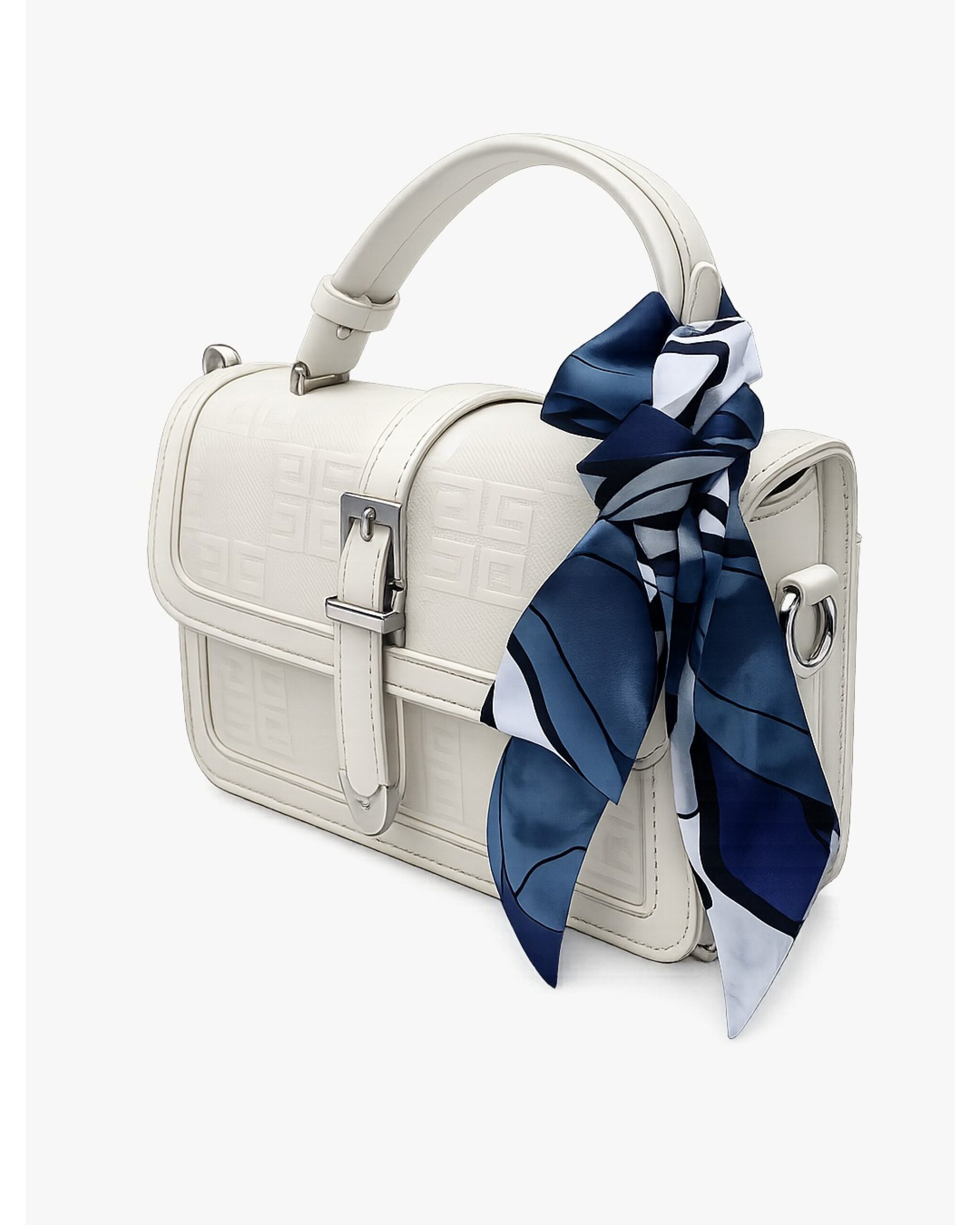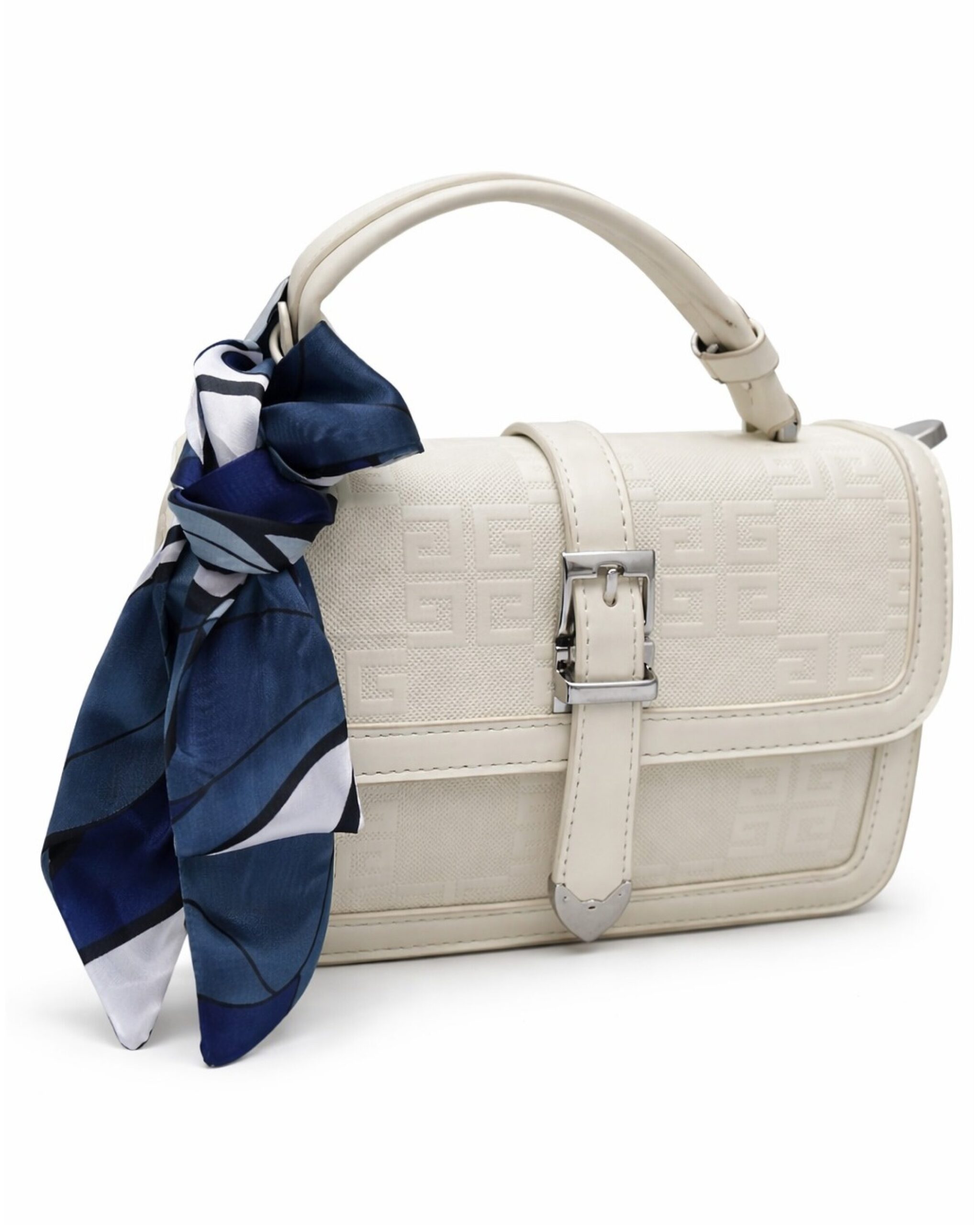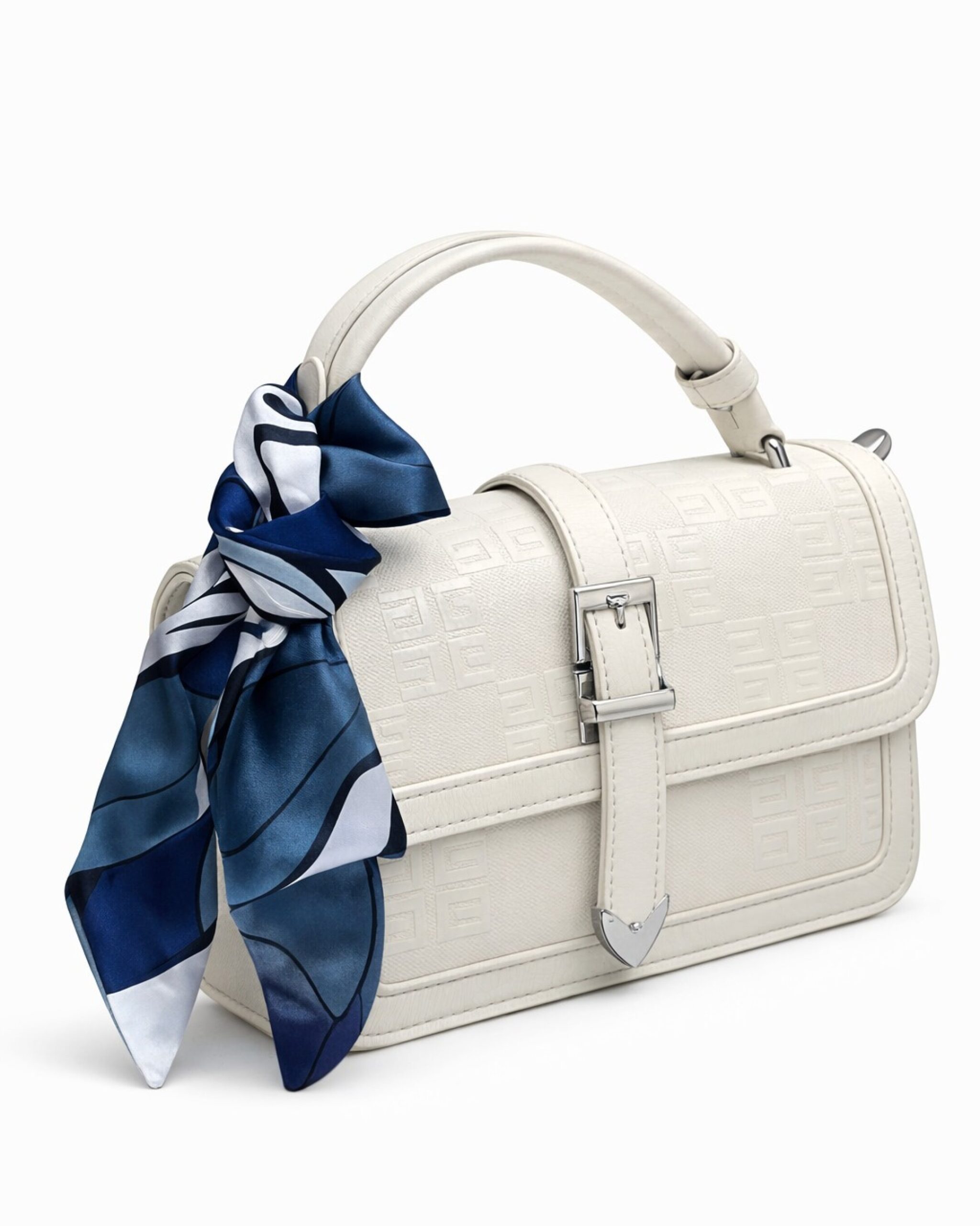 Elegant, soft, and effortlessly graceful, Aleen Ivory Muse is designed for women who love refined style with a delicate statement. The classic ivory tone paired with subtle patterned texture, polished silver buckle, and a chic silk scarf accent creates a look that feels sophisticated, feminine, and timeless.