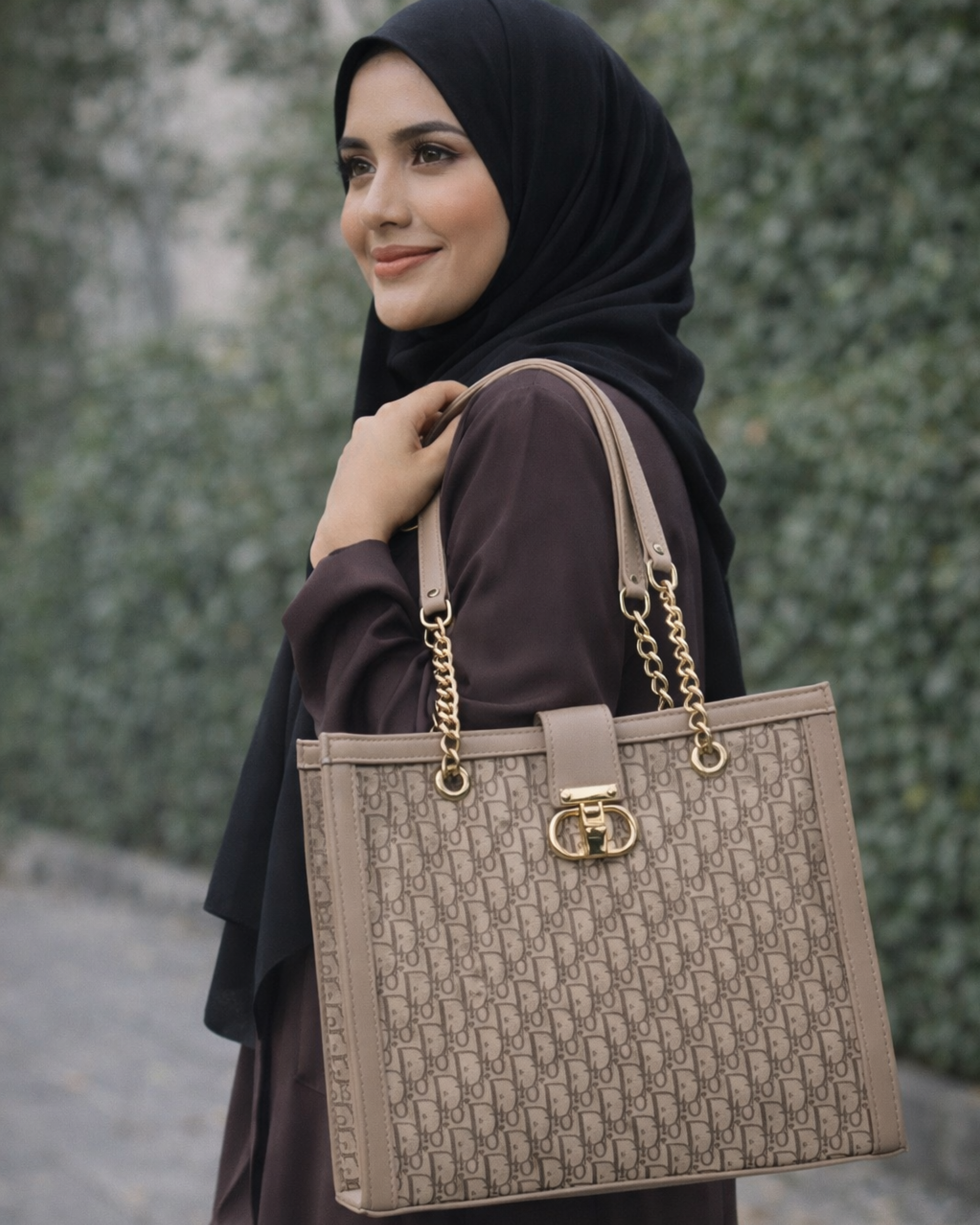 Sophisticated, structured, and effortlessly graceful, the Aleen Royal Taupe is designed for women who carry confidence with elegance. The refined monogram texture paired with gold chain handles adds a timeless luxury touch.